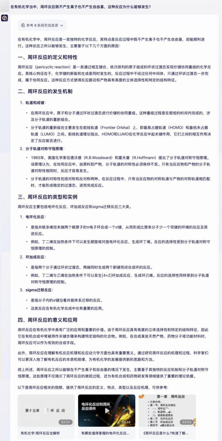 除了连环提问,也可以在问题本身上设置难度,询问一些极其专业的问题。在有机化学当中,周环反应既不产生离子也不产生自由基,这种反应为什么能够发生?结果呢,文心一言不仅解答了疑问,还补充介绍了相关化学反应的概念和分类,甚至最后还附上了视频课程,方便我们进一步学习。