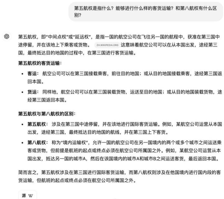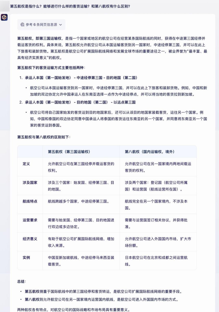 不过在实际场景中,我们不一定会一次只问一个问题,而是连珠炮似的抛出一串问题,并且说话的过程中还会出现省略,这就对模型理解问题提出了更高的要求。第五航权是指什么?能够进行什么样的客货运输?和第八航权有什么区别?这波文心一言成功捕捉了三个问题并一一给出正确解答,而且在对比两个概念的区别时还采用了表格的方式,更加易于理解其不同。