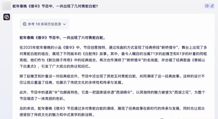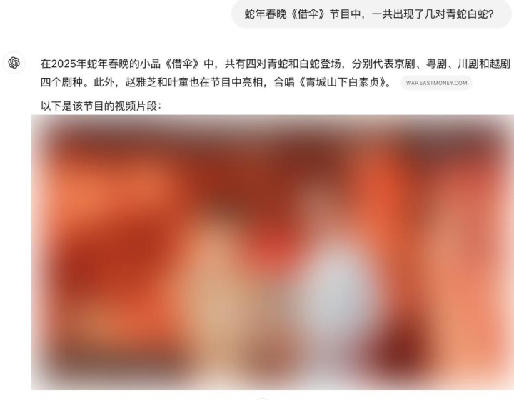 而在从模型走向应用的路上,有一项能力,它的名字不像视频生成、文本对话这样一目了然,但扮演着重要的角色。它就是刚刚提到的RAG。RAG技术,百度引领所谓RAG,就是检索增强生成,它通过引入检索机制,使得模型在生成回答时能够参考更多的信息,从而提高了回答的准确性和丰富性。RAG之所以重要,在于它可以帮助模型解决这样几个问题:一是大模型无法针对训练完成之后的信息进行回答,RAG可以迅速补充;二是大模型部分情况下存在幻觉,RAG可以通过引入外部资料降低幻觉现象;三是通过对外部资料的调用,让模型生成的答案更加权威透明。而在RAG能力上,国内同样有着一位强者,它就是百度的文心一言。光说不练没有说服力,接下来就拉文心一言和ChatGPT比试一番。既然RAG的一大用途是解决训练完成后的信息问题,考察的题目也得有时效性。蛇年春晚《借伞》节目中,一共出现了几对青蛇白蛇?(答案:六对)